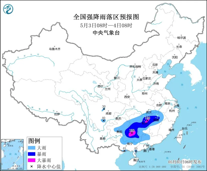 湖南省气象台2024年5月3日7时24分发布暴雨橙色预警:预计3日8时至4日8时,湘中大部分地区、湘南局部地区将出现暴雨,局地大暴雨,并伴有雷暴、雷雨大风等强对流天气,请加强防范。
