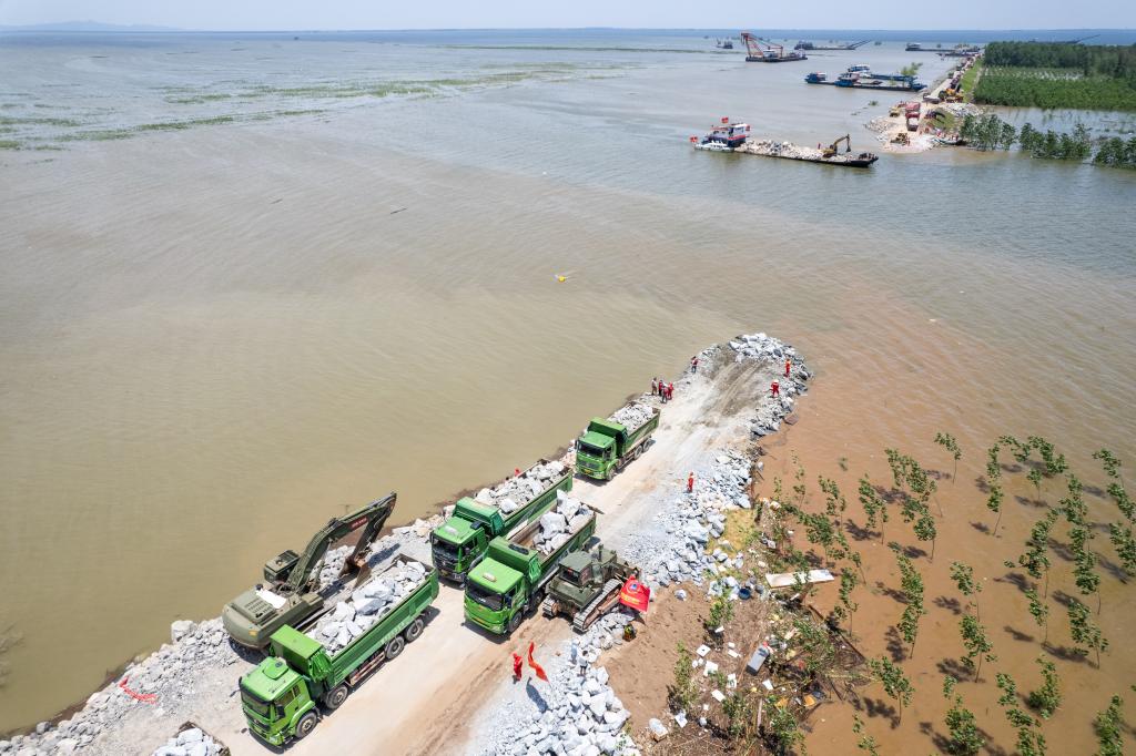 截至8日17时,团洲垸洞庭湖大堤决口封堵长度已达180.5米,剩余45.5米,预计在9日12时前完成封堵。记者在决口现场看到,一辆辆满载块石、砂卵石的卡车依次在决口两侧投放物料,大型挖掘机、推土机进行填埋作业,大型驳船同步开展水上抛投作业。