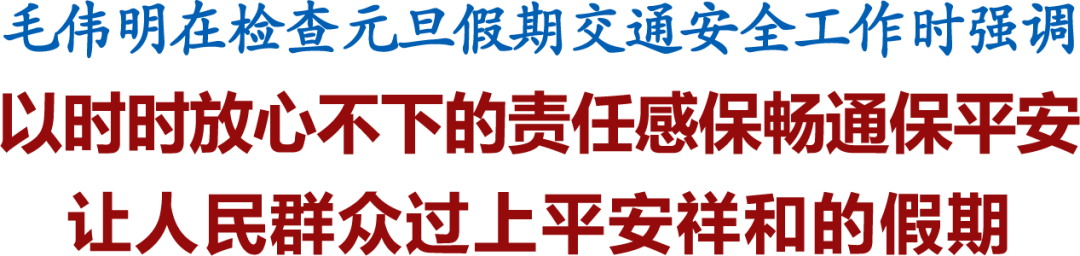 ▲12月30日上午,省委副书记、省长毛伟明在省公安厅交警总队调度元旦假期全省道路交通安全情况。 12月30日是元旦假期第一天。上午,省委副书记、省长毛伟明在长沙检查交通安全保畅工作,看望慰问坚守岗位的一线交警。他强调,要深入贯彻习近平总书记关于安全生产的重要论述,落实省委十二届五次全会部署,坚持人民至上、生命至上、安全第一,做到令行禁止强管理、齐心协力保畅通,确保全省道路交通安全形势平稳可控,让人民群众过一个幸福、平安、温暖、祥和的元旦假期。 省领导李建中、王一鸥,省政府秘书长瞿海参加。 ▲毛伟明在杭长高速长沙收费站执勤点看望省高速交警长沙支队星沙大队值班值守民警。 杭长高速长沙收费站是出入长沙的主要收费站之一,假期首日已迎来车流高峰。据预测,元旦期间全省高速公路总车流量将突破 750万台次。毛伟明来到在此执勤的省高速公路交通警察局长沙支队星沙大队一线交警中间,向大家致以节日的问候。 ▲毛伟明在省公安厅交警总队了解全省道路交通安全情况。 ▲毛伟明通过视频调度重点路段、重点区域等值班值守情况。 座谈会上,毛伟明说 今年以来,全省公安交管部门全力查违法、治顽疾、保安全、促发展,整治重点交通安全隐患5.4万起,全省道路交通事故起数和死亡人数分别下降13.37%、13.22%,连续4年实现重特大事故“零发生”,为打好安全生产翻身仗提供了有力支撑。 毛伟明指出