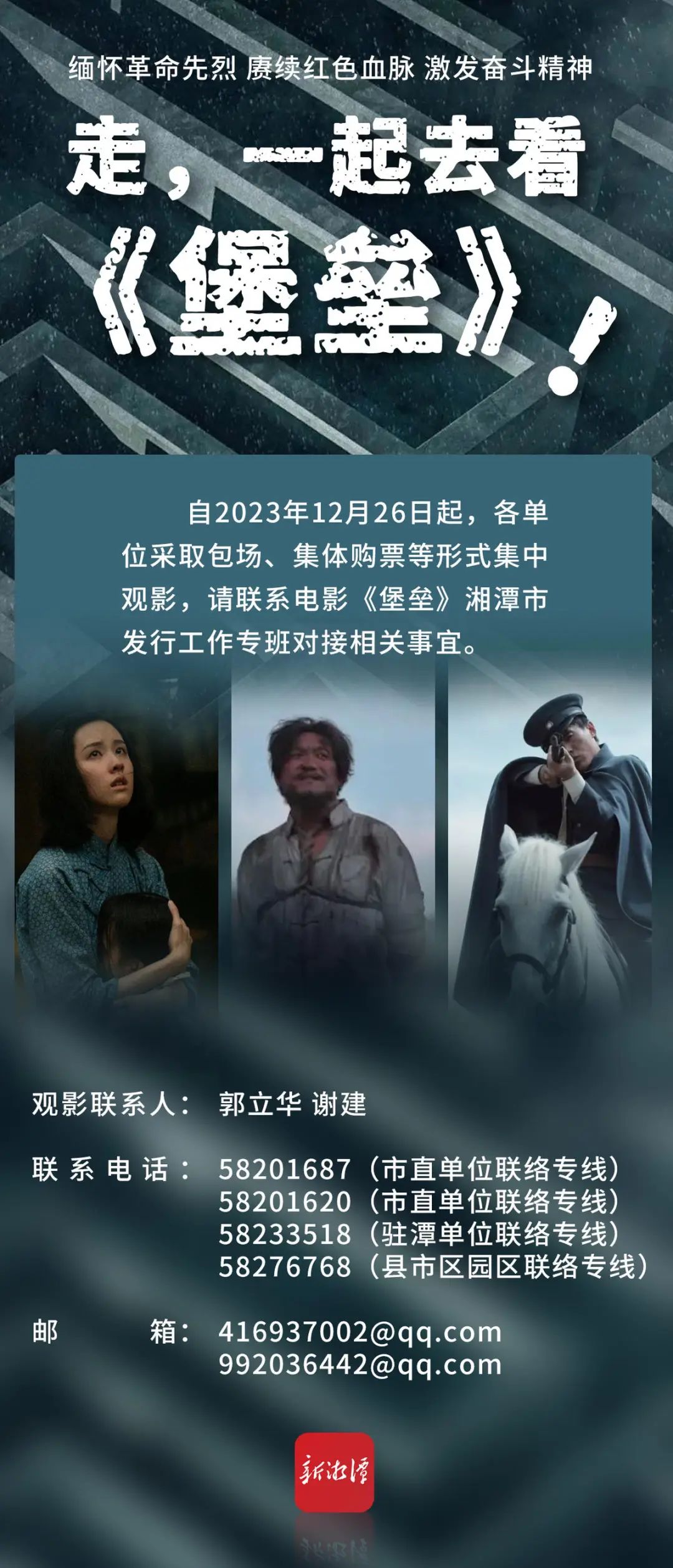 “余为革命奋斗牺牲,对于己身毫不挂念。”“勇敢的少年可以触摸到星星。”……连日来,不少单位组织党员干部走进电影院观看《堡垒》,共同回顾可歌可泣的历史,缅怀革命先烈。 电影《堡垒》由湘潭市委、市政府牵头策划,市委宣传部具体负责,潇湘电影集团有限公司、天津猫眼微影文化传媒有限公司、湘潭日报社、湘潭昭山文化产业发展有限公司、湘潭城乡建设发展集团有限公司、湘潭市广播电视台、韶山高新建设投资有限公司联合出品。 这是一部为纪念毛泽东同志诞辰130周年,历时3年推出的红色经典影片。电影以1925年6月毛泽东同志亲手创建的,我党历史上最早成立的农村党支部之一的中共韶山特别支部为故事原型,讲述了特别支部的第一批共产党员“韶山五杰”(毛福轩、毛新梅、李耿侯、钟志申、庞叔侃)从在韶山创建兴起党支部,开展轰轰烈烈的农民运动到投身地下党工作,成为卧底同国民党斗智斗勇的故事。影片采取类型化的电影创作,融入谍战和悬疑元素,具有很强的观赏性。 电影《堡垒》的创作阵容也非常强大——由刘宁担任制片人,韩可一担任编剧和导演,陈明昊、郭晓东、李一桐、陈都灵、薛皓文等演员出演。 为讲好党的故事、革命故事、湘潭故事,充分发挥红色题材电影作品对广大党员干部群众的教育作用,缅怀革命先烈,赓续红色血脉,激发奋斗精神,中共湘潭市委宣传部、中共湘潭市委组织部、中共湘潭市直属机关工作委员会、湘潭市教育局、湘潭市总工会、中国共产主义青年团湘潭市委员会、湘潭市妇女联合会七个部门联合发文,决定在全市广泛组织观影活动,欢迎各单位采取包场、集体购票等形式集中观影。