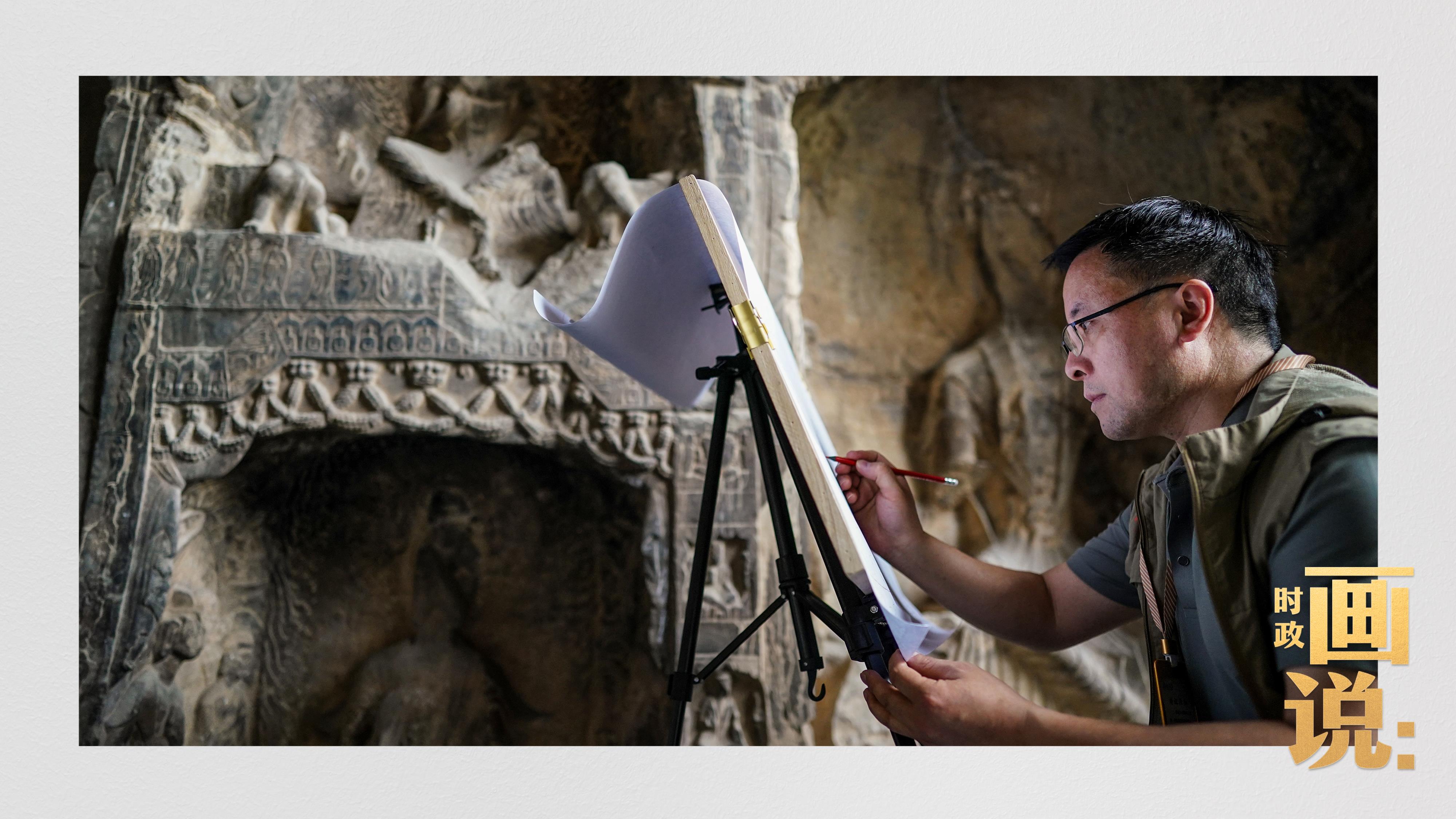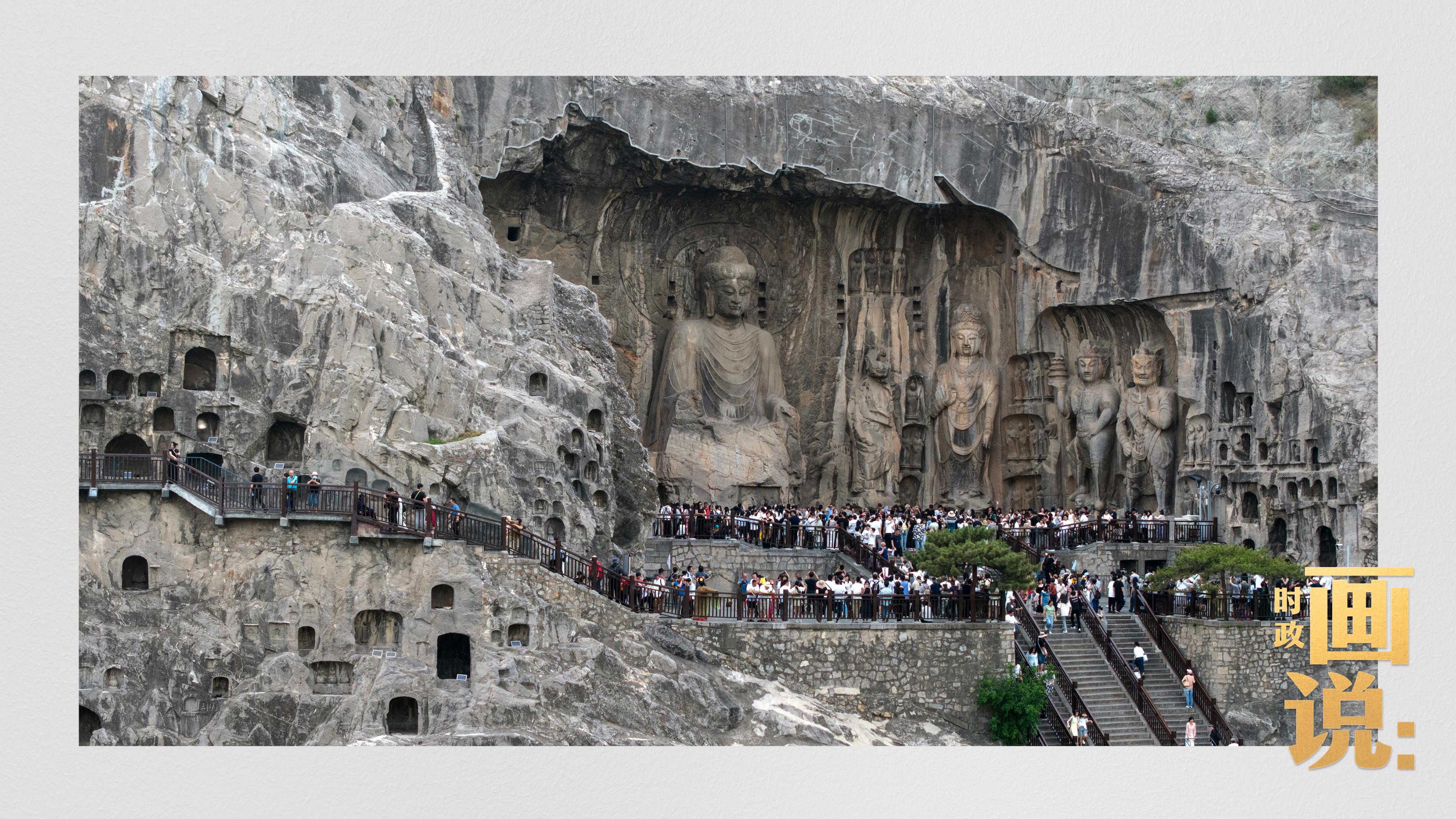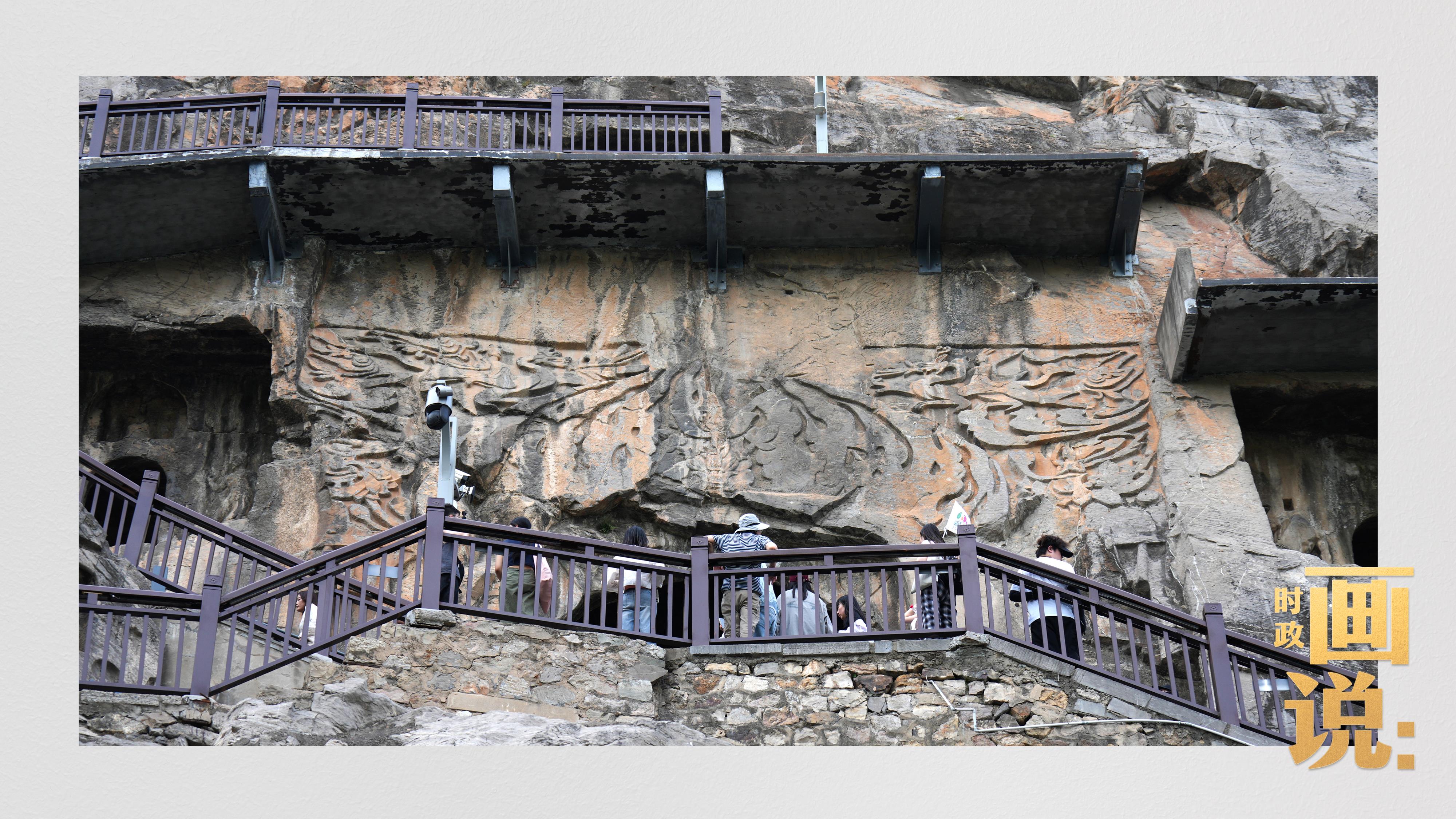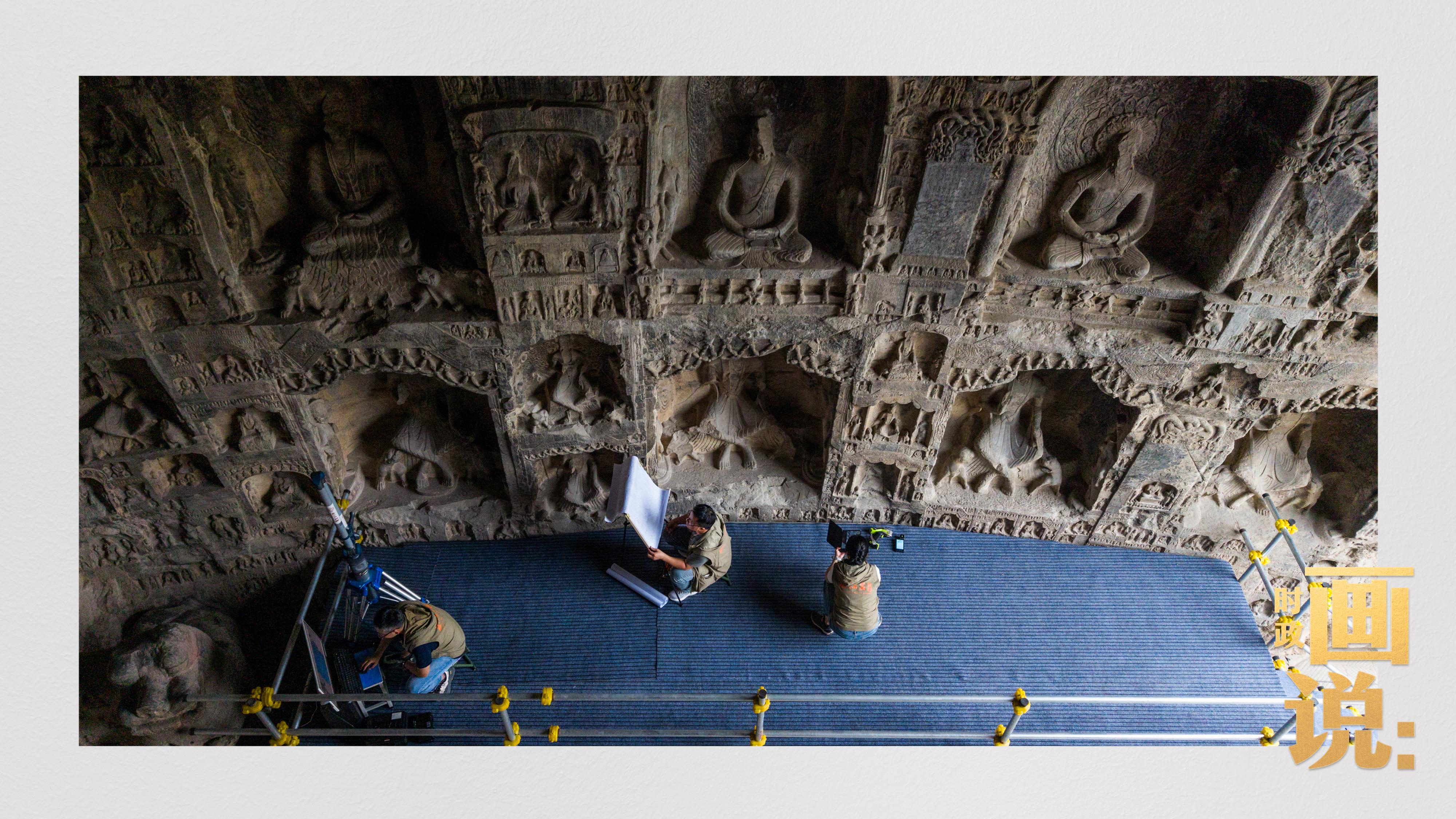 △龙门石窟研究院工作人员在古阳洞使用关节臂扫描仪对佛像进行数字化扫描