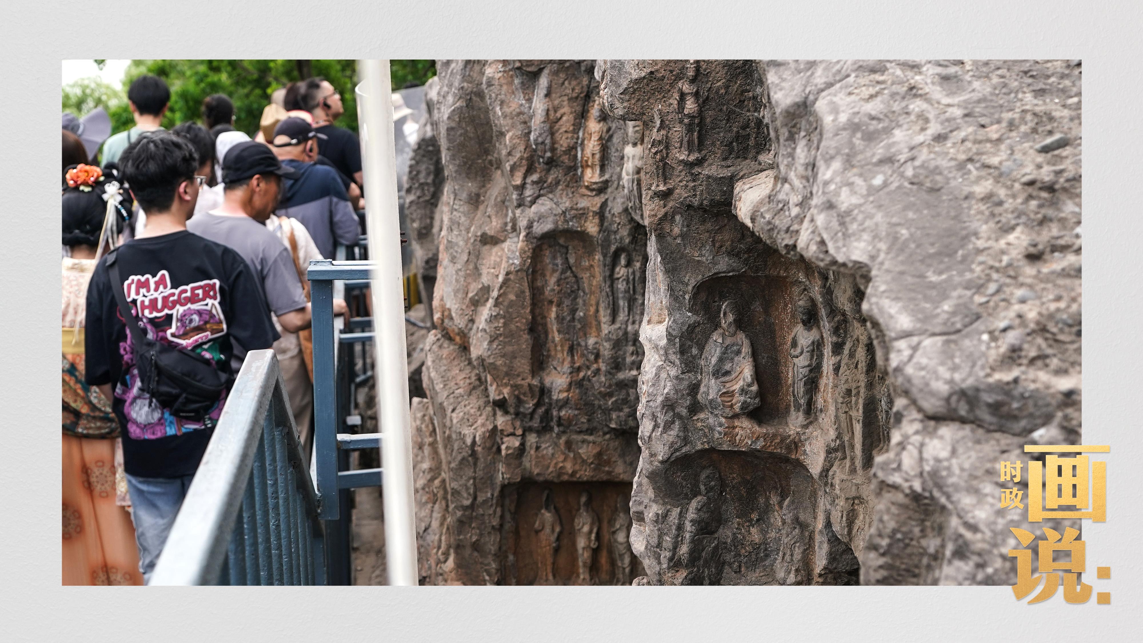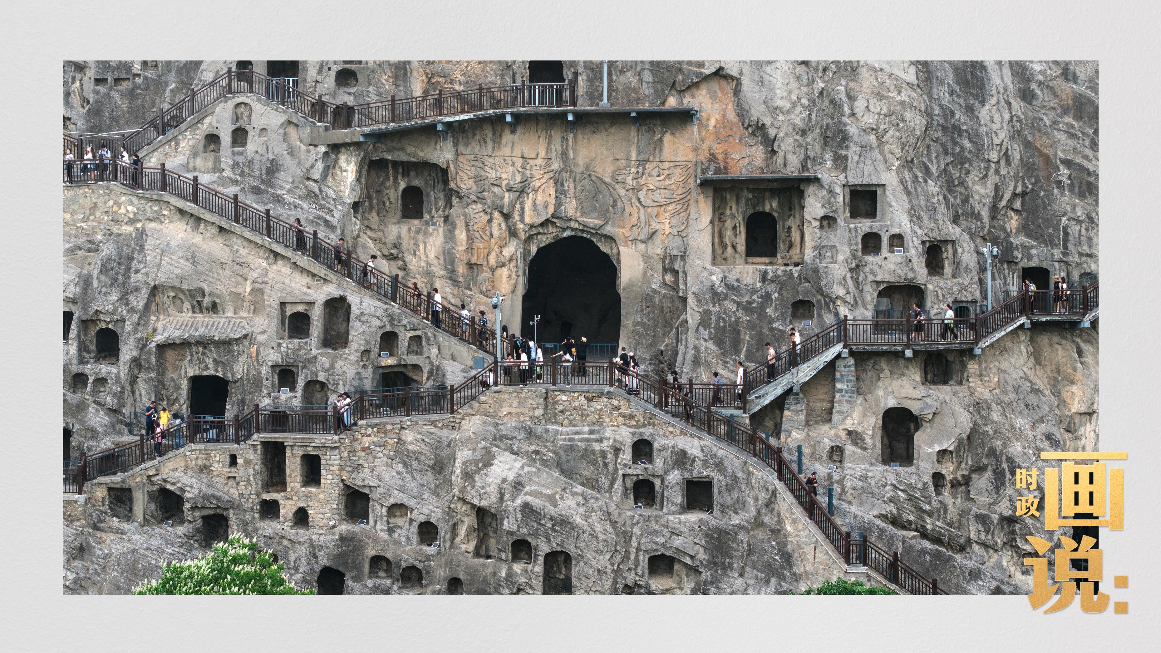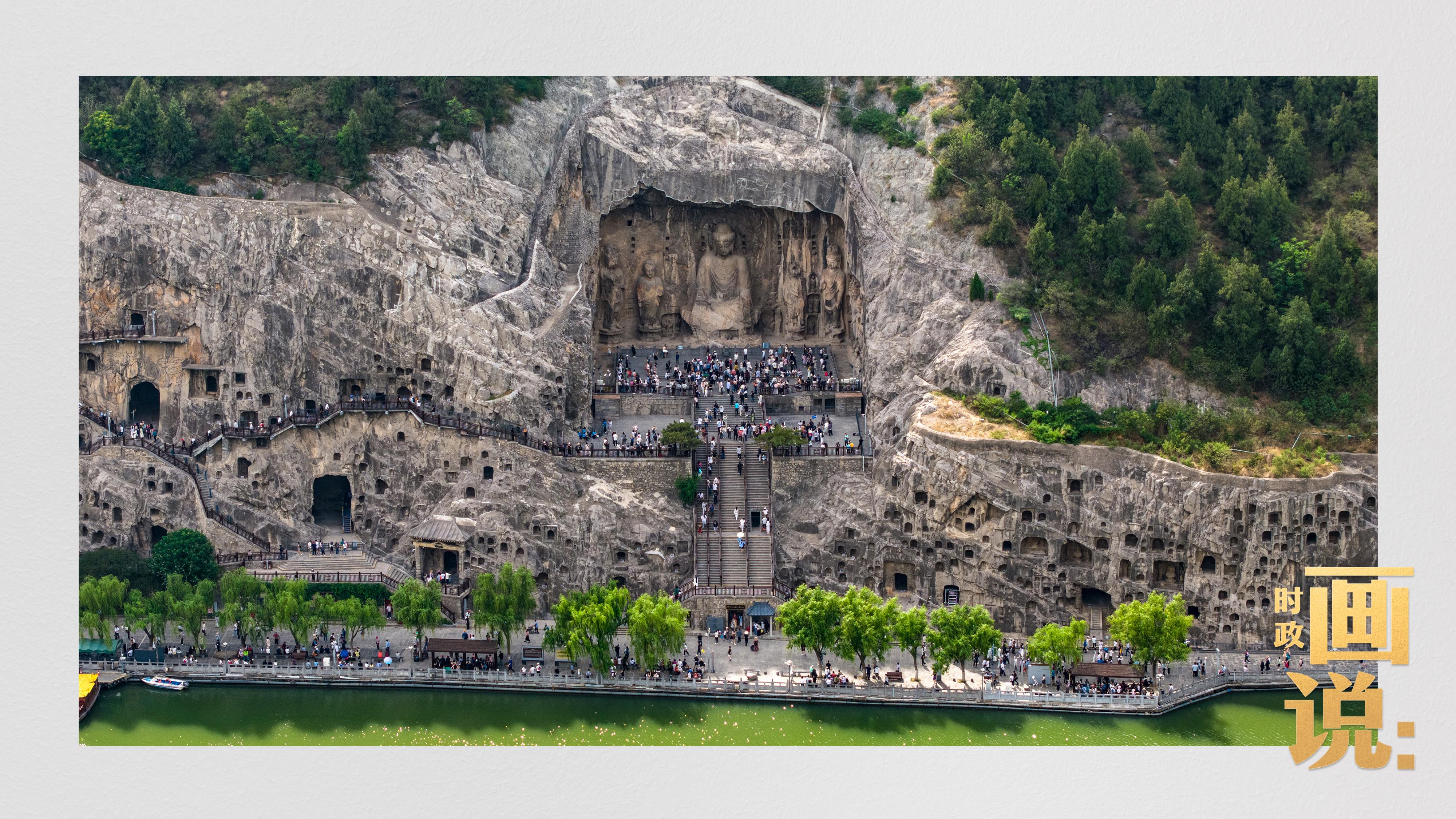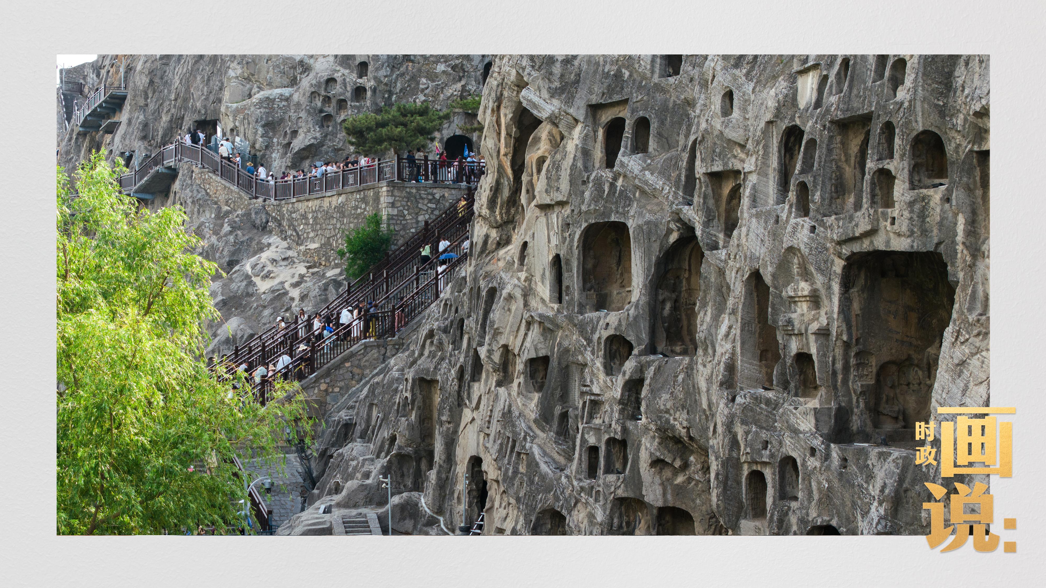 △龙门石窟研究院工作人员在古阳洞使用关节臂扫描仪对佛像进行数字化扫描