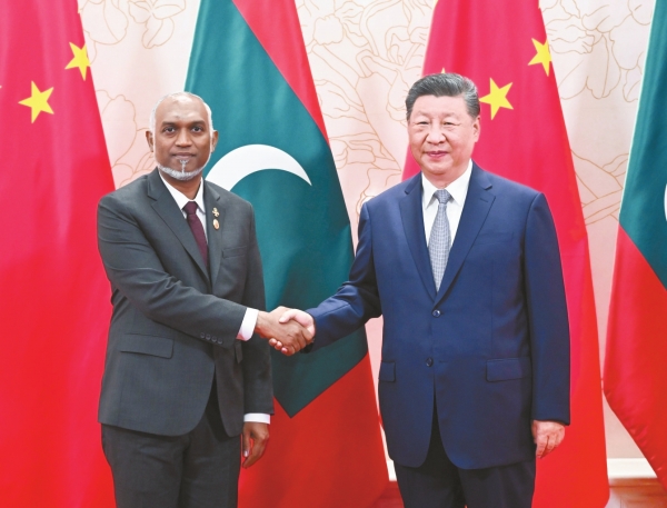 8月31日上午,国家主席习近平在天津迎宾馆会见来华出席2025年上海合作组织峰会和纪念中国人民抗日战争暨世界反法西斯战争胜利80周年活动的马尔代夫总统穆伊兹。新华社 发