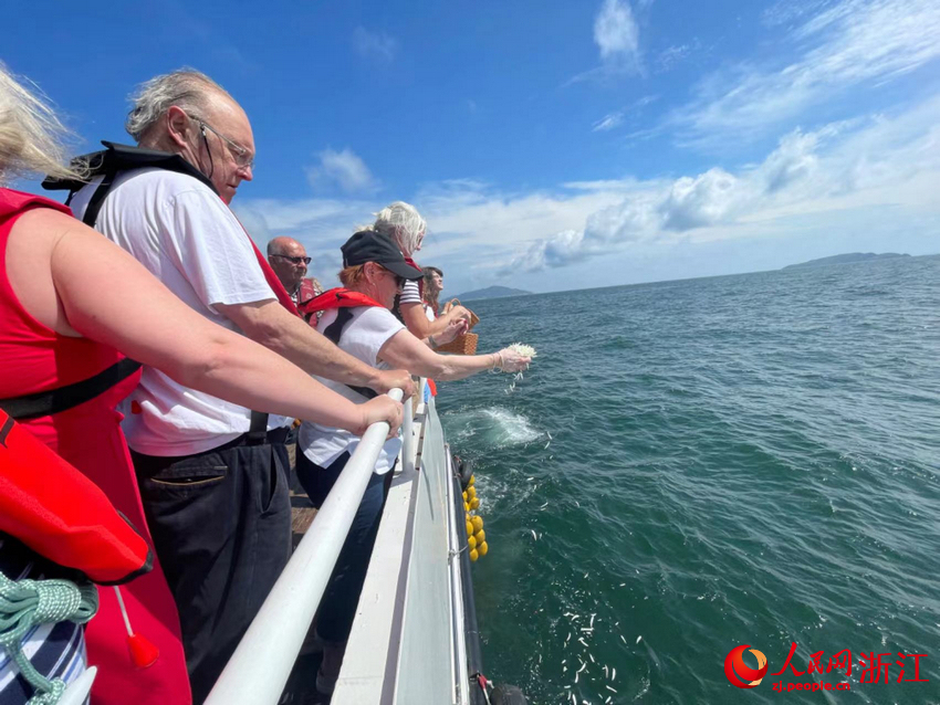 “里斯本丸”号船英军战俘后人将白色花瓣撒向蔚蓝的大海。人民网记者 王丽玮摄