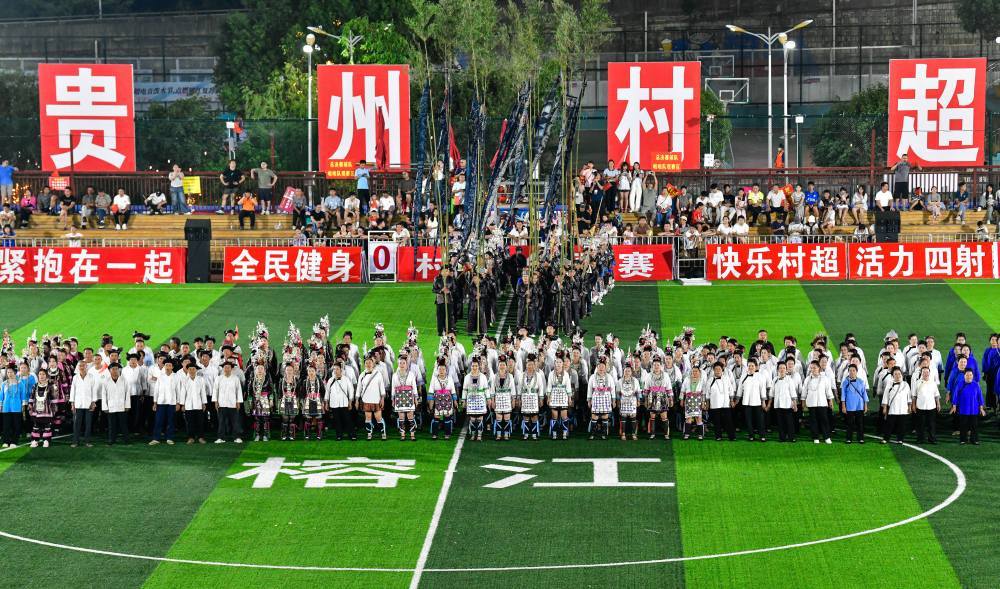 2025年8月23日,村民们在贵州“村超”球场演唱侗族大歌。当日,2025年首届“村超”全国赛总决赛在贵州榕江县“村超”球场举行。赛事期间同时举办丰富多彩的民族歌舞展演、无人机表演、大型烟花秀,吸引数万观众现场观赛。近年来,贵州“村超”“村BA”等草根赛事持续升温,巧妙融合体育竞技、民族文化与文旅消费,打造“体育+”模式,撬动乡村流量与经济增量,赋能乡村振兴。