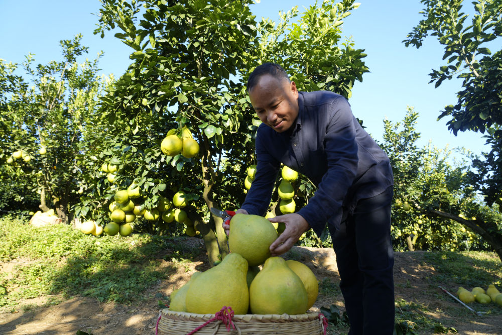 2025年11月7日,柚农在梅州南福金柚种植基地测试柚子甜度。