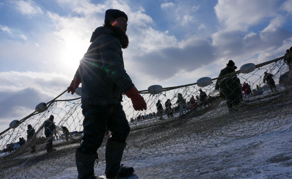 2026年1月7日,渔民们将渔网拖出查干湖冰面