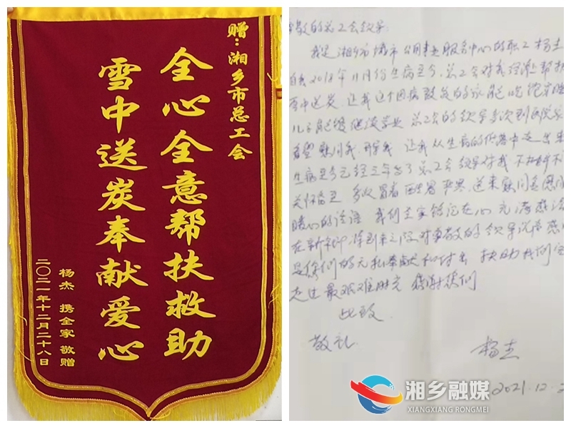 中国湘乡网1月4日讯(通讯员:谭俊)日前,困难职工杨杰的家人将一面印有“全心全意帮扶救助 雪中送炭奉献爱心”的锦旗和一封感谢信送到市总工会负责人手中,感谢市总工会对杨杰的关心和帮助。