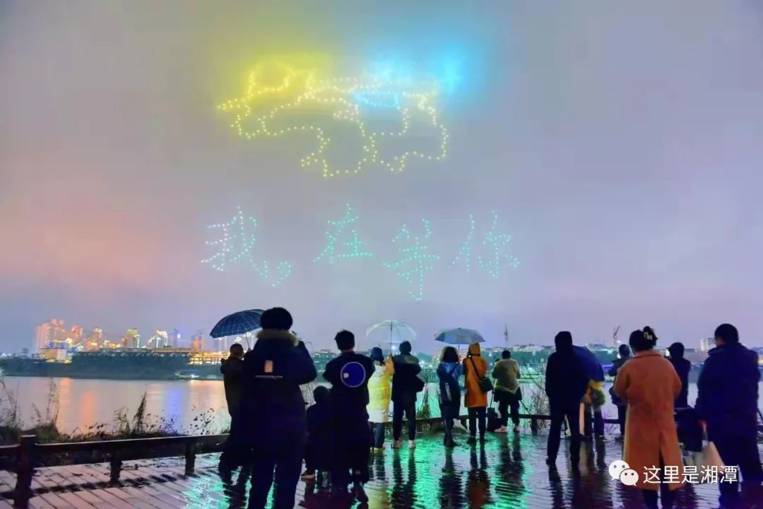 1月26日晚上,千架无人机空降湘潭十八总·湘江图,在小年夜,为湘潭市民带来了一场视觉盛宴。