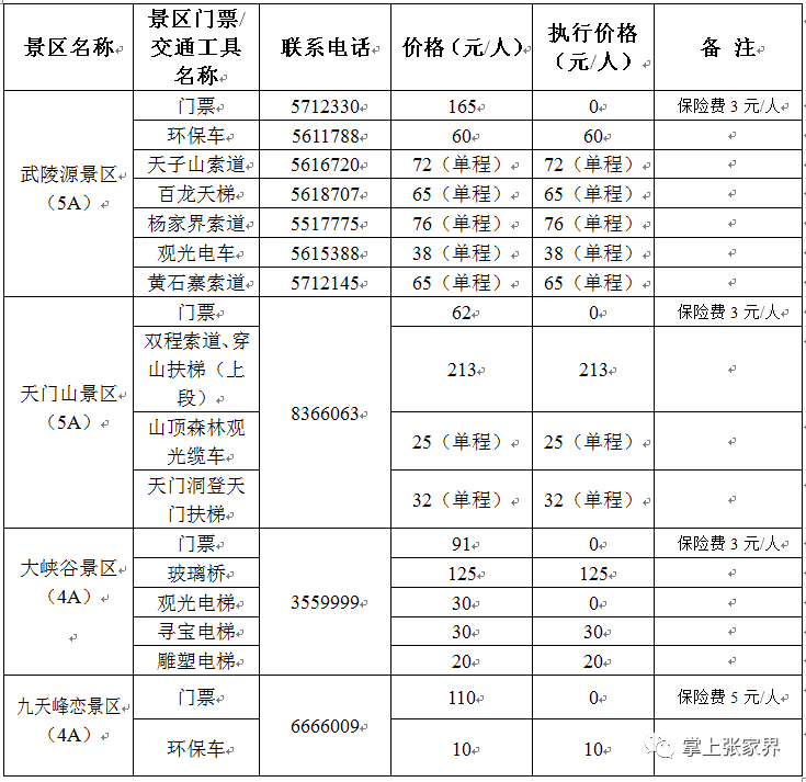 张家界武陵源景区,即张家界武陵源风景名胜区,包含张家界国家森林公园、天子山自然保护区和索溪峪自然保护区,不包含黄龙洞景区、宝峰湖景区。武陵源景区门票价格为165元/人, 4月30日至5月10日实行免票优惠,不含保险费和景区内环保车、天子山索道、百龙天梯、黄石寨索道、杨家界索道、十里画廊观光电车等交通工具费用。