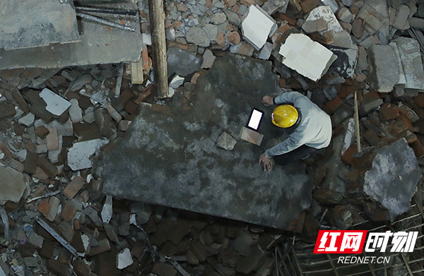 静默搜索不定时进行着,5月4日晚8时14分,红网时刻新闻记者又经历了一次,现场叫停了所有可能发生声响的活动,为生命探测仪创造静默环境,只为寻找希望的可能。