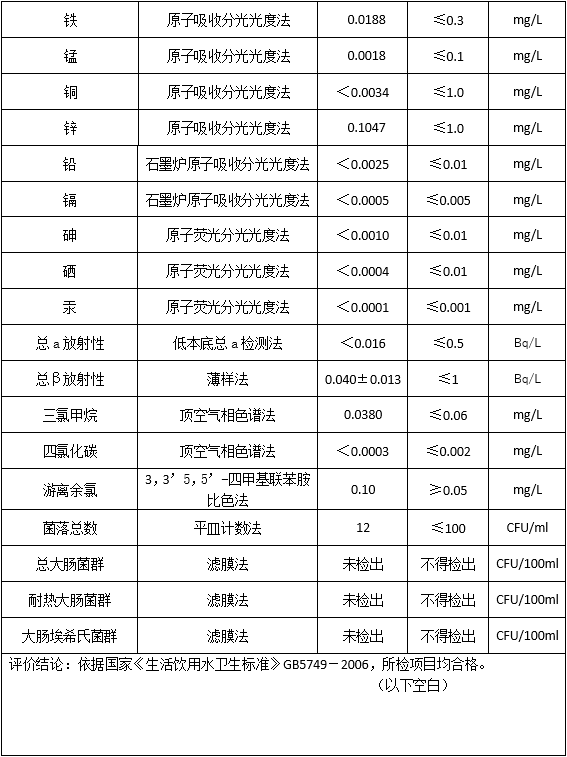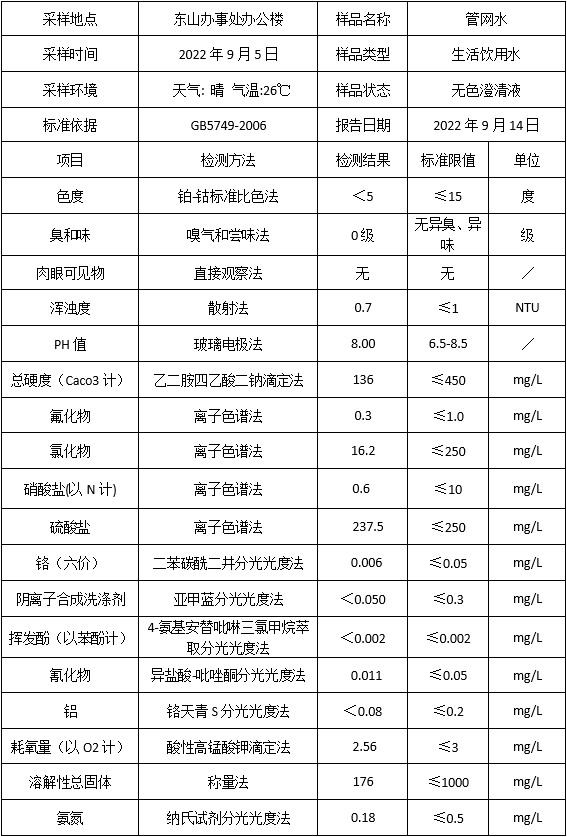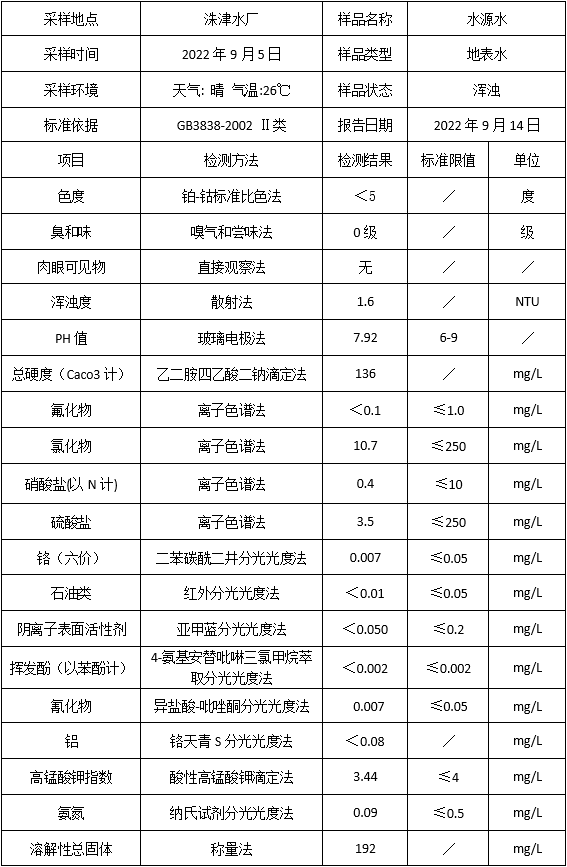 2022年9月份湘乡市振湘供水有限公司水质检验报告