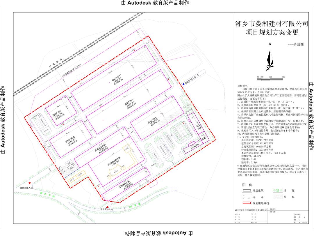 规划说明:该项目位于湘乡市毛田镇潭山村和大坡村,规划总用地面积93743.75平方米,合140.15亩。因企业扩大规模发展需要及公司生产工艺流程需要,需对原规划进行变更,变更内容如下: