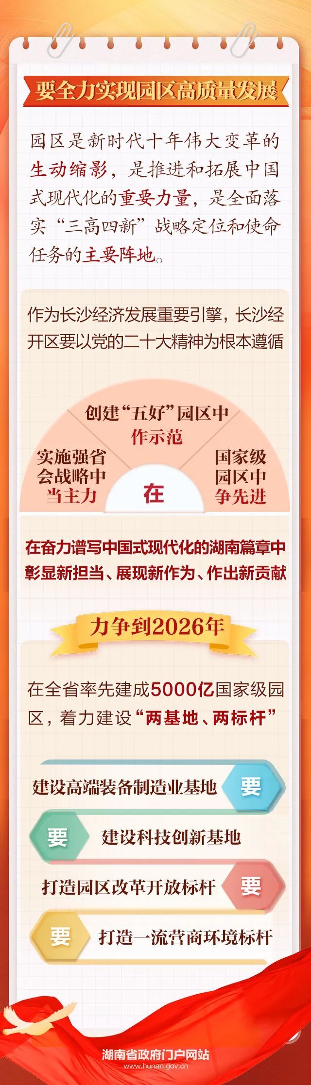 他强调,要深入学习宣传贯彻党的二十大精神,落实习近平总书记“五个牢牢把握”,以及“全面学习、全面把握、全面落实”的重要要求,切实用党的二十大精神武装头脑、指导实践、推动工作,全面落实“三高四新”战略定位和使命任务,把“五好”园区打造成引领全省高质量发展的强力引擎,奋力谱写新时代坚持和发展中国特色社会主义的湖南新篇章。
