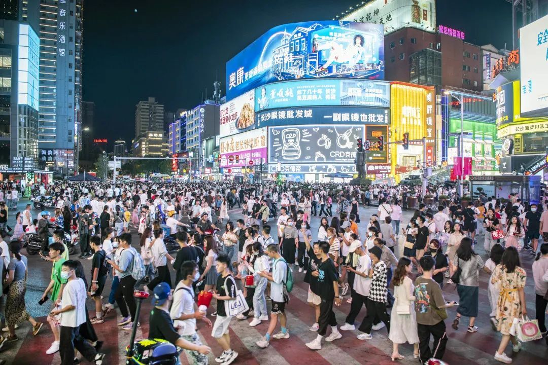 (2022年10月1日晚,长沙市五一商圈人头攒动,“网红”长沙吸引大批游客前来游玩、购物。湖南日报全媒体记者 李健 摄)