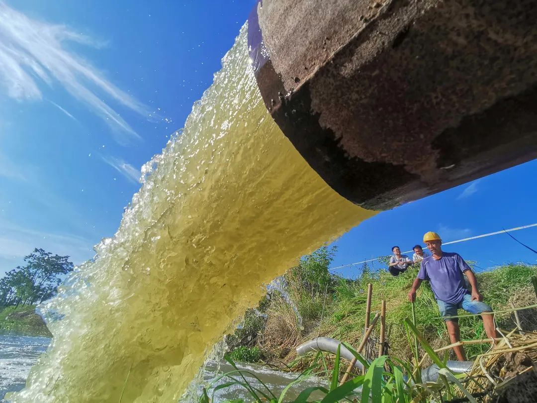 (2022年8月15日,临湘市江南镇鸭栏村12组,村民用水泵从冶湖里抽水到引水河渠道,保障农业灌溉用水。湖南日报全媒体记者 郭立亮 摄)