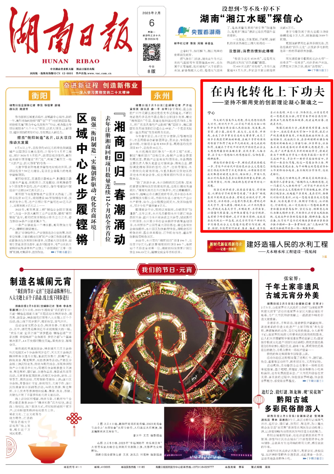 2月6日-2月8日《湖南日报》连续3天在头版位置发表“宁心”署名文章,这3篇文章系统地阐释了如何用党的创新理论凝心聚魂,提出了在“六化”上下功夫,“六化”即在理论学习上做到内化、转化,在理论研究阐释上做到体系化、学理化,在理论宣传上做到通俗化、大众化。这“六化”为我们学习宣传阐释党的创新理论提供了遵循,值得反复体悟,躬身实践。