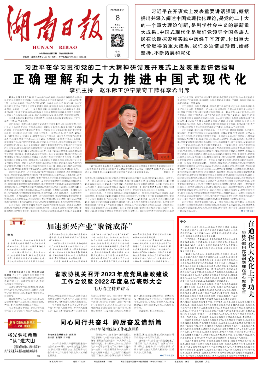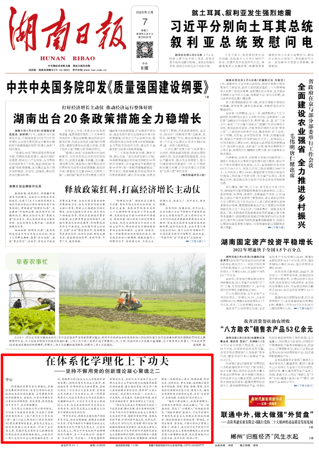 “宁心”文章是中共湖南省委宣传部重点打造的理论宣传品牌。这“三论”作为“宁心”文章2023年的首发之作,瞄准的正是深入学习贯彻习近平新时代中国特色社会主义思想这一党的重大创新理论,指向的是坚持不懈用党的创新理论凝心聚魂、指导实践。