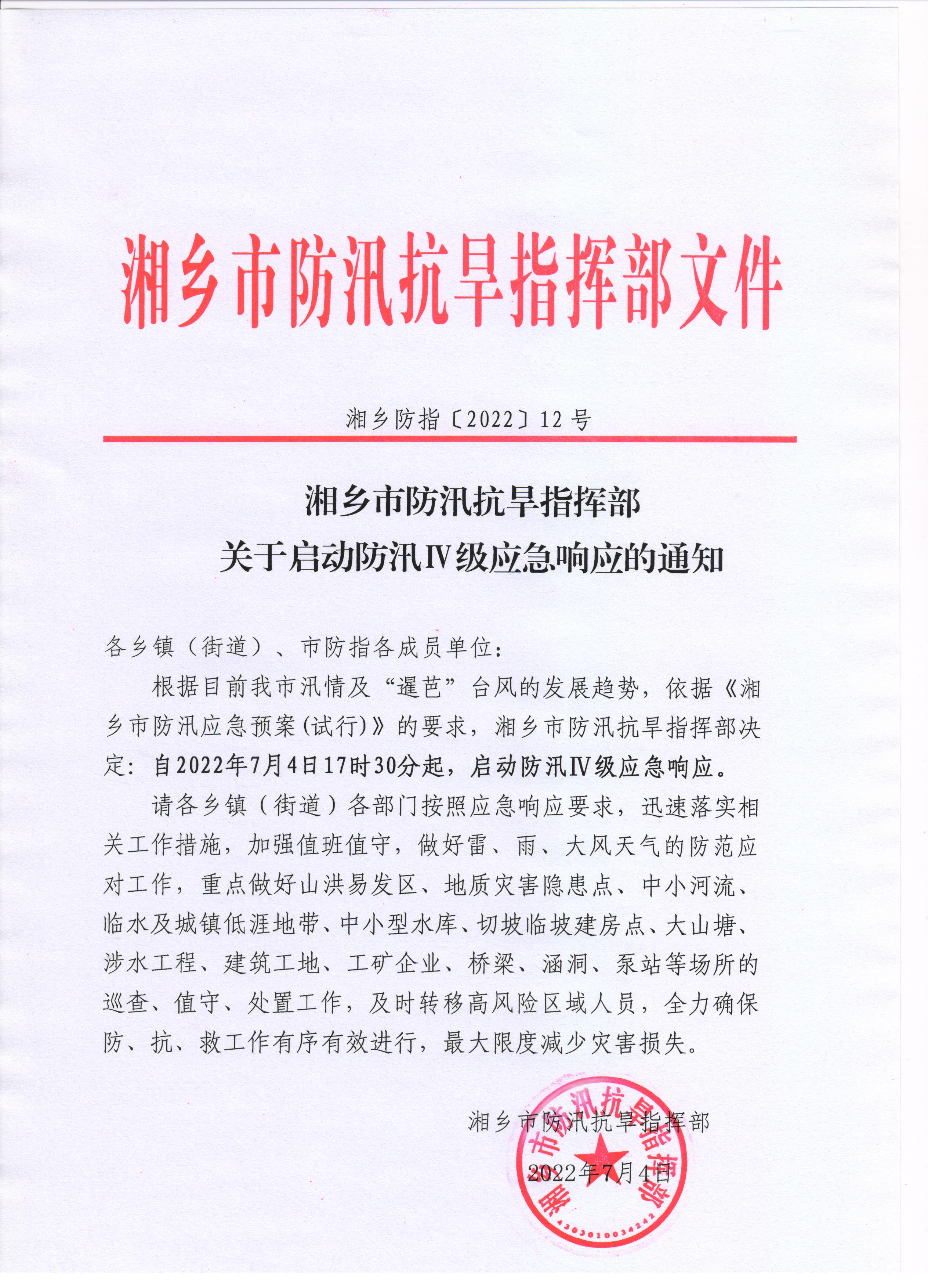 湘乡市防汛抗旱指挥部关于启动防汛Ⅳ级应急响应的通知
