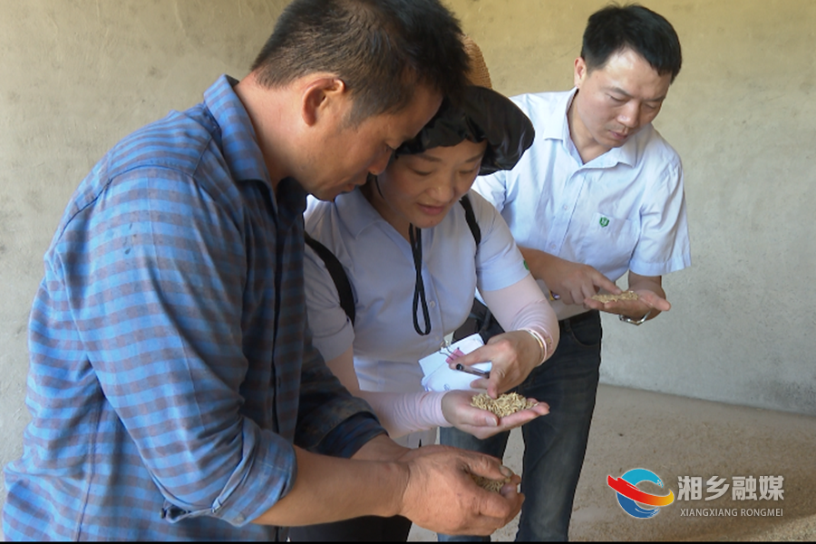 中央储备粮湘潭直属库有限公司湘乡分公司工作人员现场了解粮食种植、品种、质量、产量等情况,并将已烘干的早稻进行分点取样、打包装袋和登记。