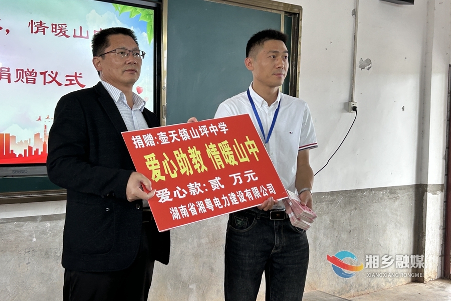 活动现场,湖南省湘乡市电力建设有限公司、湖南国新建设有限公司、华南方圆电力设备有限公司等七家爱心企业负责人将14万元爱心款交到山坪中学负责人手中,用于学校基础设施建设、完善配套功能、加强师资力量等,进一步推动学校教育优质发展。