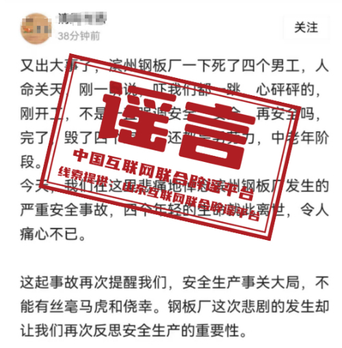 谣言:山东滨州钢板厂发生安全事故死了四个工人?